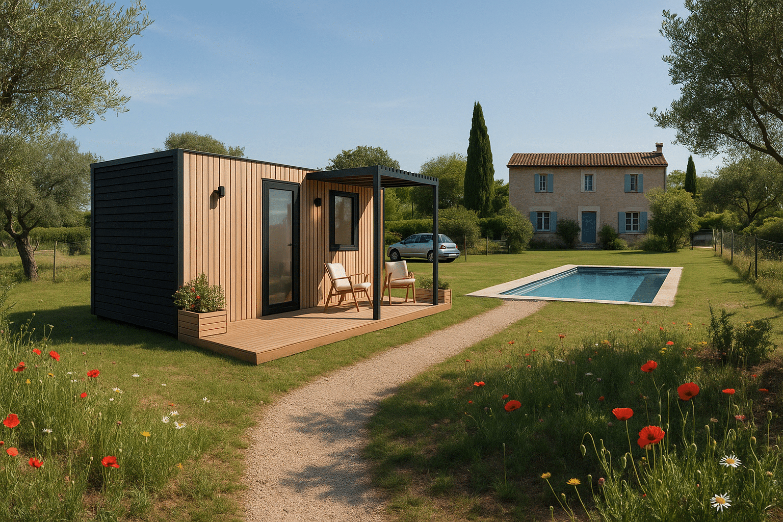 - Le revêtement extérieur : Bardage bois naturel, bois teinté, composite, ou enduit, pour s’harmoniser ou trancher avec votre maison principale.